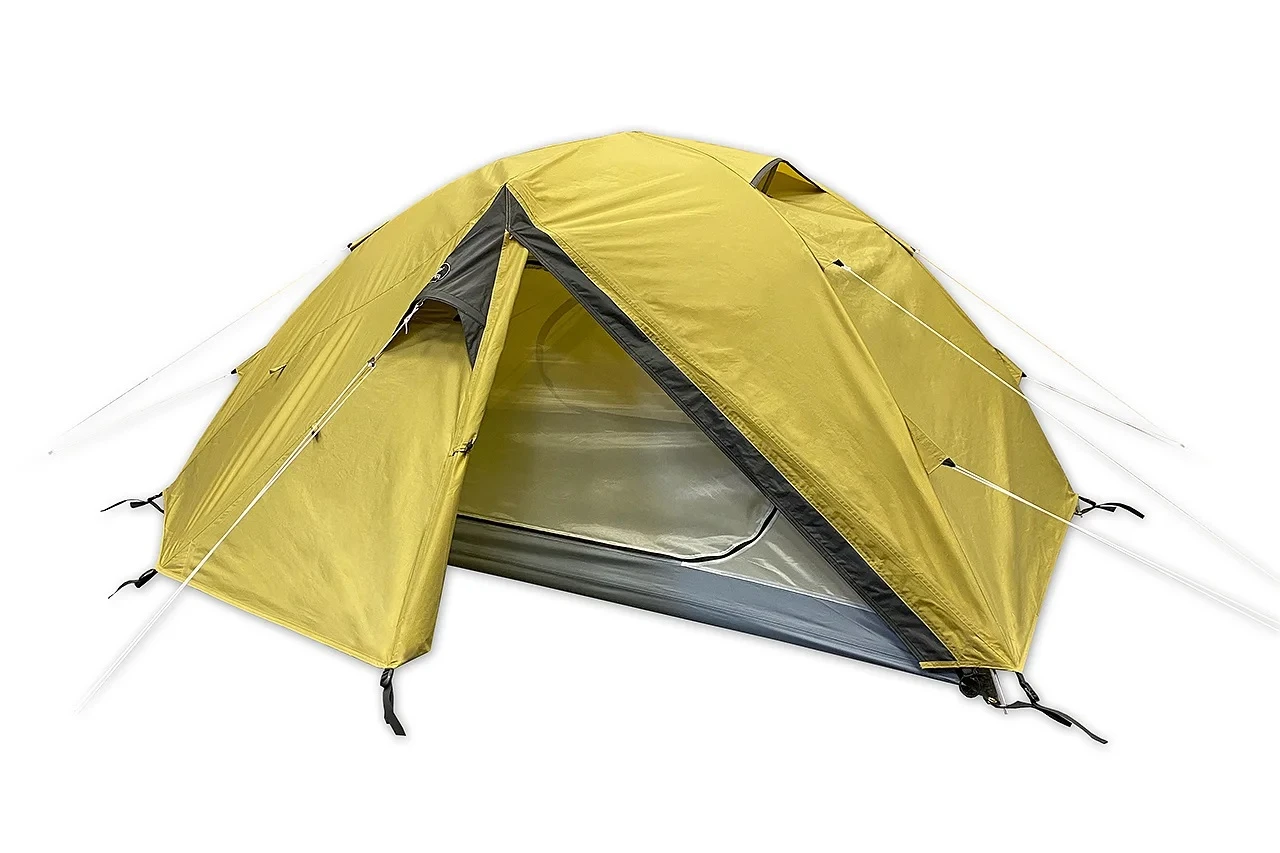 Das Zelt ist aus einem 75D Ripstop-Polyester gefertigt und verfügt über 8.000mm Wassersäule am Boden. In Kombination mit dem 8,5mm Aluminiumgestänge hält es einem starken Sturm problemlos Stand. Das Trekkingzelt hat eine Firststange, ein zusammengebautes Komplettgerüst und ein innenliegendes, farblich eloxiertes Gestänge. Zuerst wird das Innenzelt aufgebaut und dann die Aussenhaut darüber gelegt und fixiert. Aufbaudauer ca. 4-5 Minuten