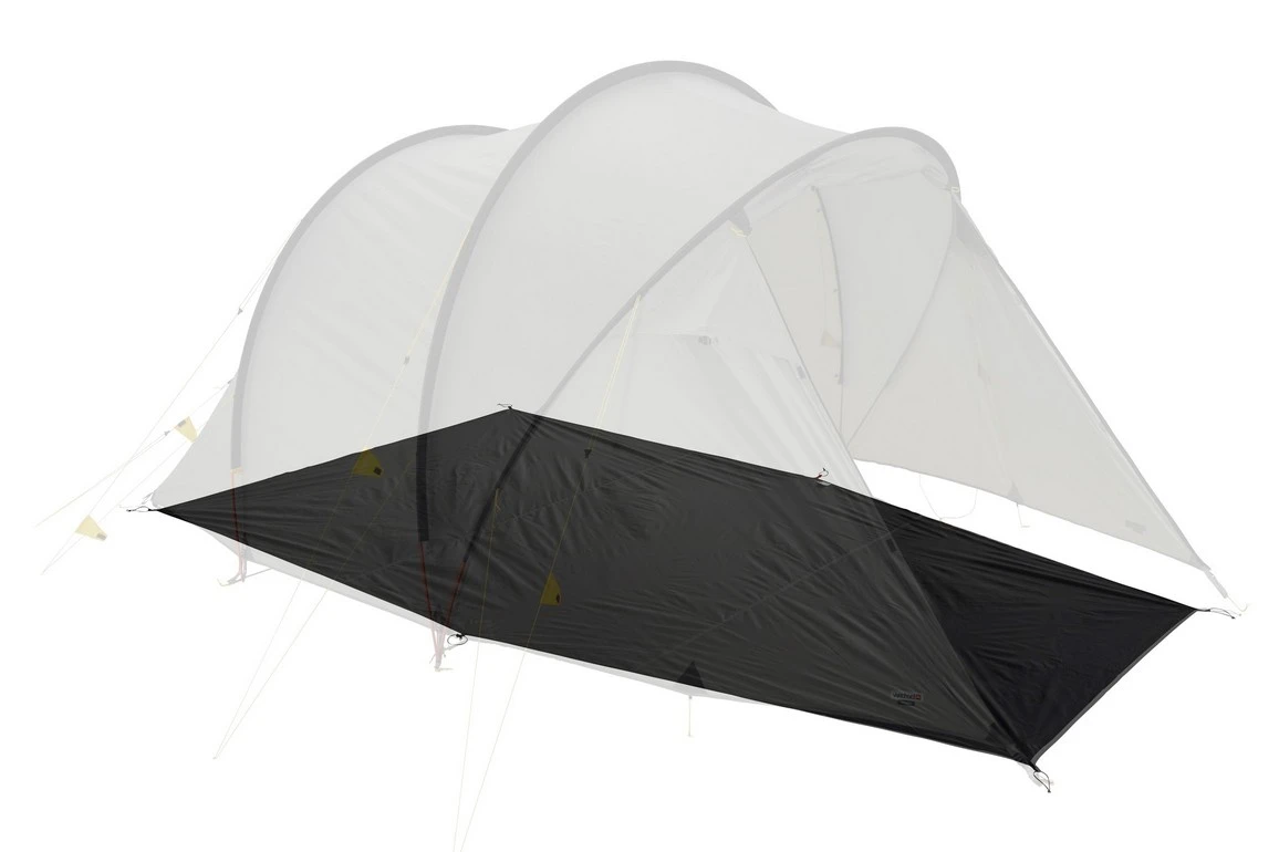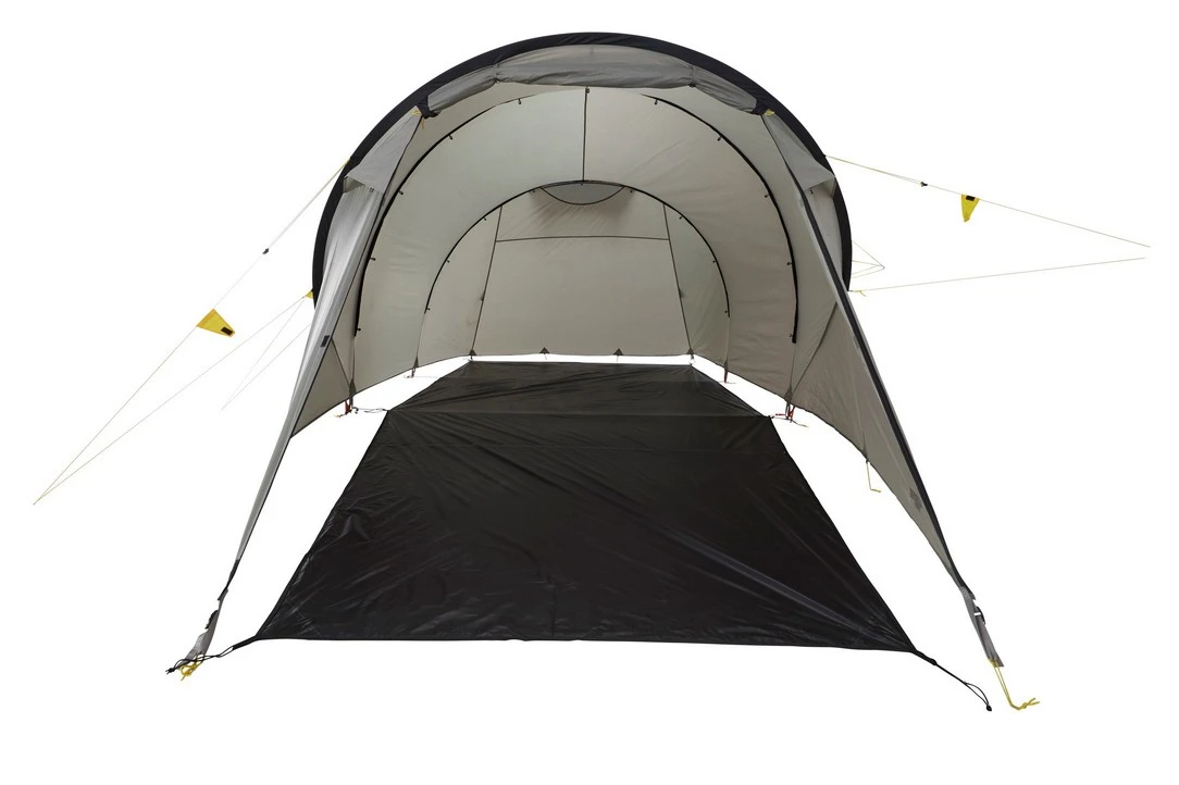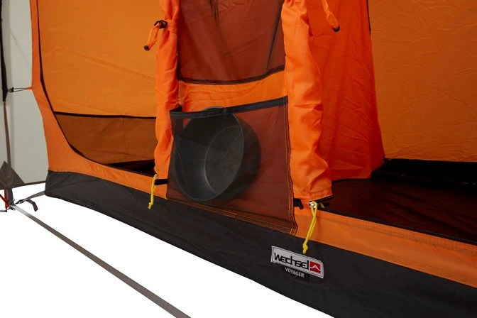 Der Eingangsbereich ist auch bei geöffneter Tür überdacht. Hier findet vier Stühle und ein Tisch seinen Platz. Optional erhältlich ist das Tarp „Wing L“. Dieses ist genau auf das Voyager abgestimmt. Es wird in vorhandene Befestigungspunkte am Zelt befestigt und bildet so ein großes Vordach im Bereich vor dem Zelt.