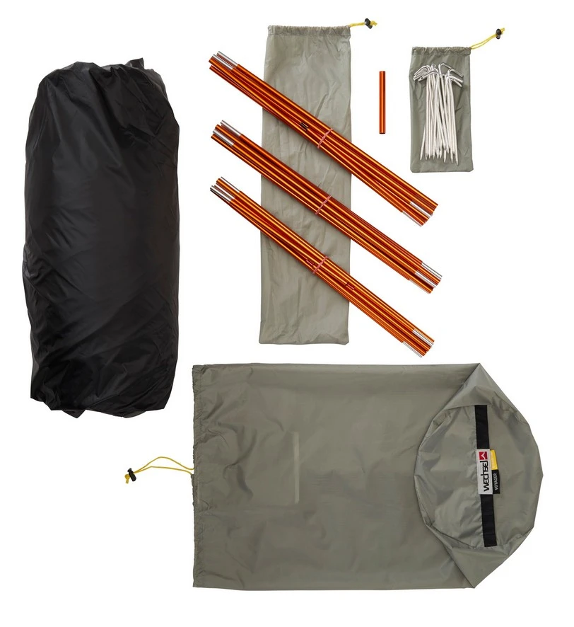- Lieferumfang: Zelt, Packsack, Heringe, Abspannleinen, Reparaturhülse